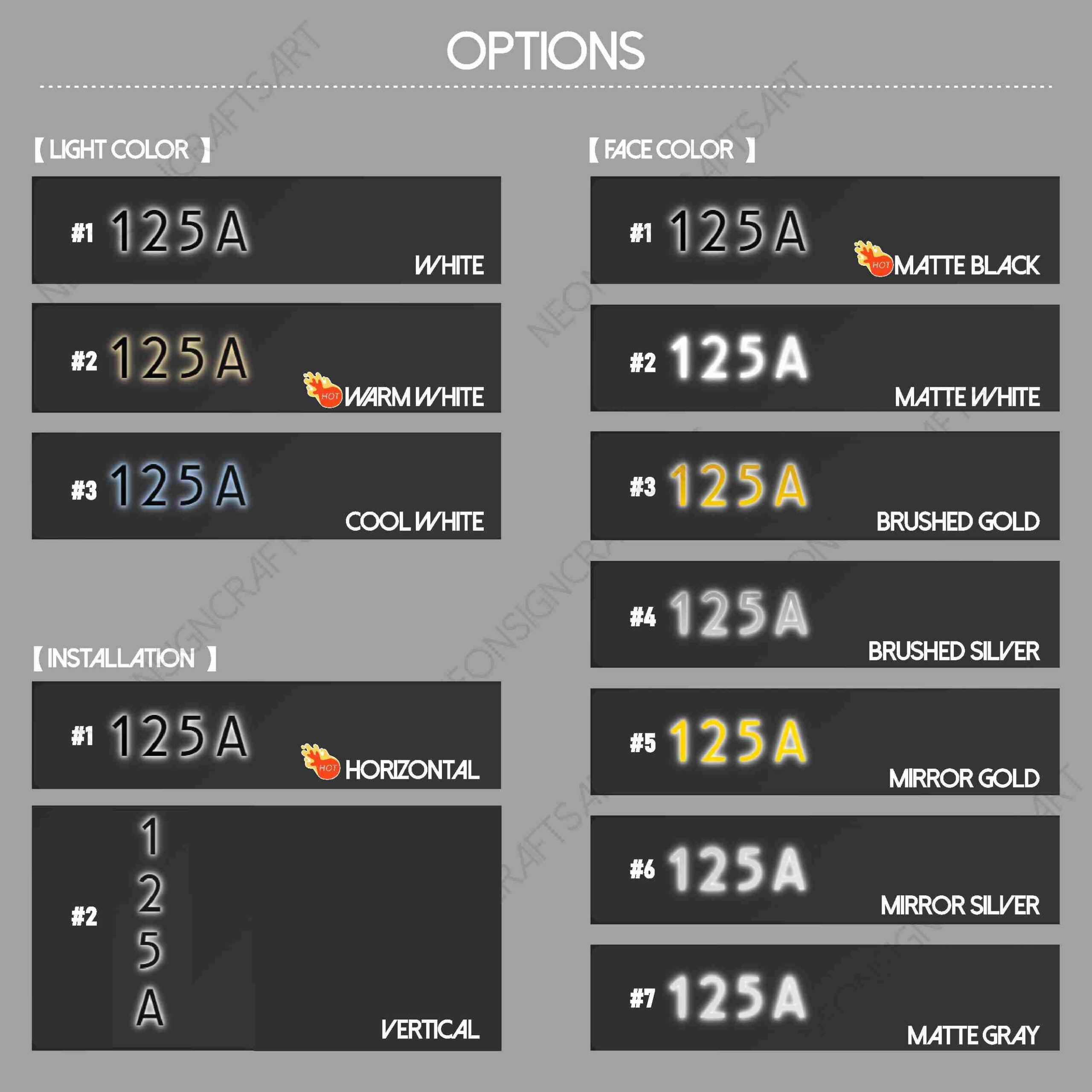 • Customization: Digits, Font, Finish, LED lighting (optional)