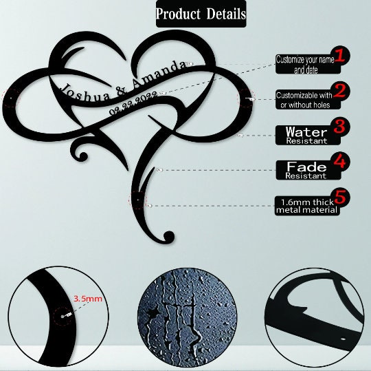 Add a personal touch to your home decor with our exquisite Personalized Metal Infinity Heart Sign. This elegant wall decor piece features an infinity symbol interwoven with a heart shape, making it a perfect representation of everlasting love and warmth. Customizable and Versatile: Express your creativity by customizing this metal sign with names, initials, or a special message of your choice. Whether it’s for your family, a loved one, or a friend, this thoughtful and unique gift is perfect for any occasion—be it Christmas, Valentine’s Day, Mother’s Day, housewarming, or a milestone anniversary.